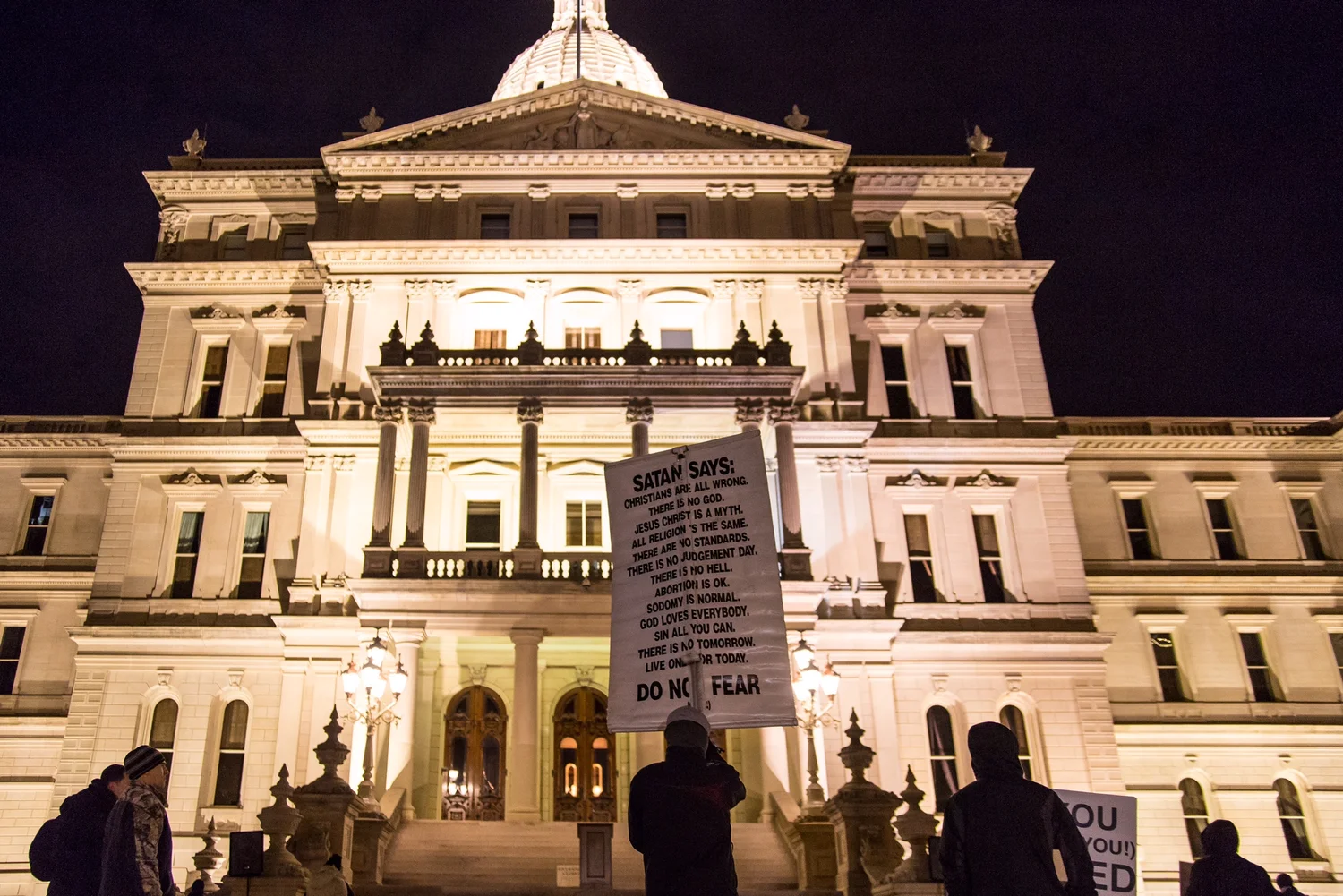 the Detroit chapter of The Satanic Temple received approval to perform a Satanic ceremony on the Michigan statehouse lawn. The ceremony took place on December 19, 2016 and was a historic event - marking the first ever Satanic ceremony performed at a state capitol. The event was a response to a live nativity performance sponsored by the Ted Cruz campaign held the same week, a expression of Christian pride which could have easily been a private display at any of the innumerable local churches rather than state Capitol grounds. The Satanic ceremony was a public declaration of Satanic ideology inspired by political rallies where divisions between the religious and the civic often blur. Video by Matt Anderson. Photos by Bruno Vanzieleghem. Read a full transcript of the speech.